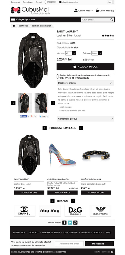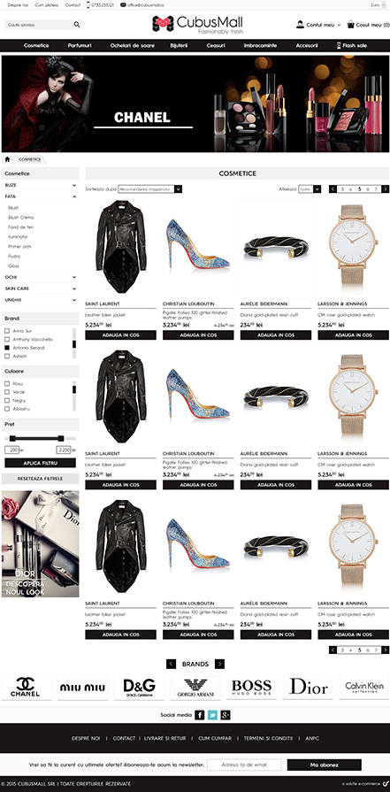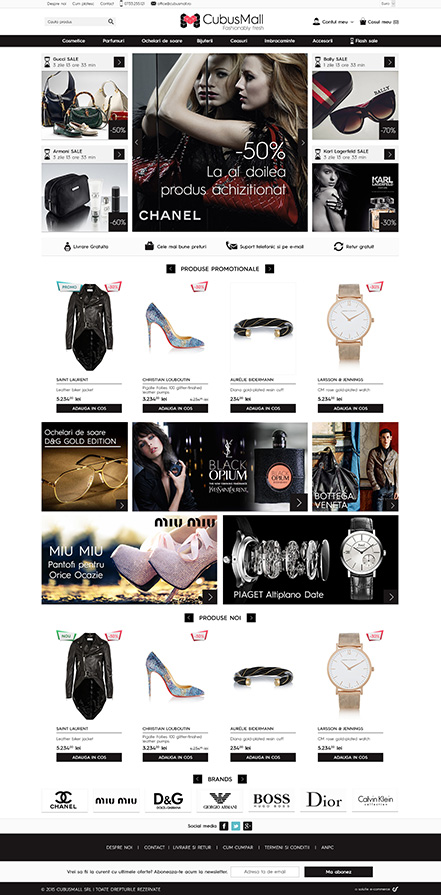 Cubus Mall este unul dintre cei mai noi jucatori pe piata de Fashion Online. Realizat special pentru piata internationala, dar si pentru Romania, magazinul se remarca prin pasiunea pentru fashion, care se observa in alegerea produselor comercializate. Cubus Mall ofera spre vanzare o selectie impresionanta de articole de vestimentatie, accesorii, parfumuri si cosmetica. Produsele date spre vanzare sunt produse premium, produse de lux. Cubus Mall se bucura de o relatie directa cu toti dealerii oficiali de brand-uri renumite, astfel poate sa ofere produse autentice si de cea mai buna calitate. Toate produsele comercializate pe site sunt noi.